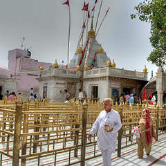 The Temple of Shri Naina Devi Ji is situated on a hilltop in the Bilaspur District of Himachal Pradesh in India. It was built by a Gurjar Shepherd. The temple is connected with National Highway No. 21. The temple at the top of the hill can be reached via road (that curves round the hill up to a certain point) and then by concrete steps (that finally reach the top). There is also a cable car facility that moves pilgrims from the base of the hill all the way to the top.